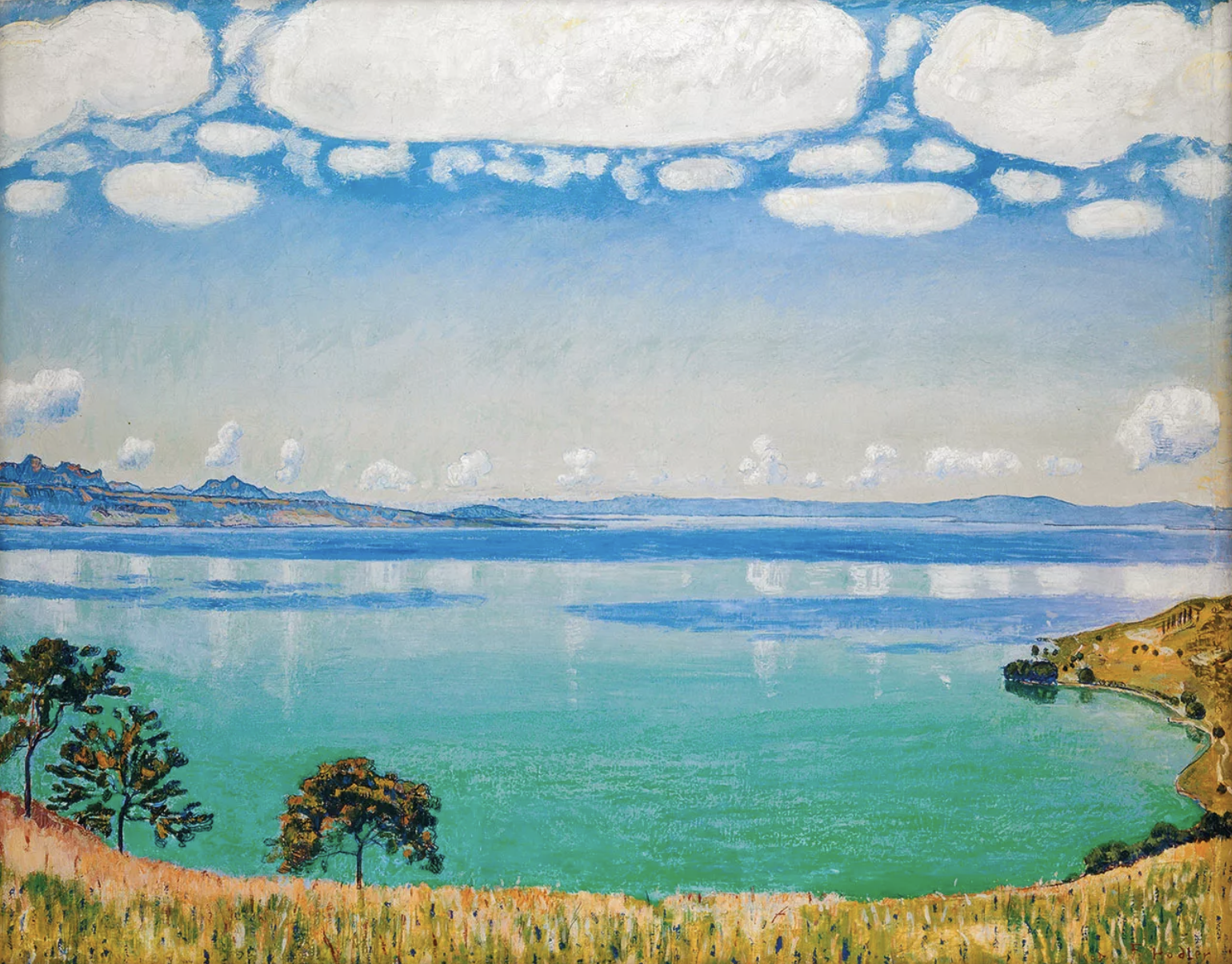 Both pictures are from Ferndinand Hodler: le Léman depuis Chexbres, 1905. The first picture peers south-eastward at the break of dawn, second picture westward in the afternoon.